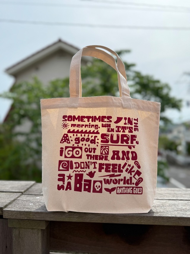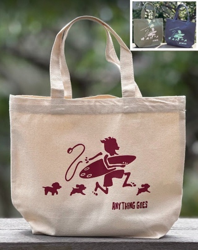 街とビーチへのお出かけにぴったりの オリジナルキャンバストートバックです♪ サーファーと3匹のワンコがビーチへ走る姿をデザインした、遊び心満載のアイテムとなっています。 ユニセックスなデザインなので、男女問わず楽しくお使いいただけます。 丈夫なキャンバス生地を使用しており、耐久性が高く、日常使いにも最適です。 しっかりとした作りで、荷物もしっかり収納できるのが嬉しいポイント! 肩掛けしやすいハンドルは、持ち運びも楽々。 海辺でのレジャーや街のお買い物など、さまざまなシーンにマッチします。 ◆カラー: 1.ナチュラル ロゴ(エンジ) 2.ストーンブルー ロゴ(パステルグリーン) 3.リーフグリーン ロゴ(ホワイト) ◆サイズ:[サイズ展開] S,M,L,W S :W22cm×H25cm×D10cm 持ち手37cm 約5L 写真はSサイズです。 M :W24cm×H37cm×D12cm 持ち手55cm 約10L L :W33cm×H40cm×D15cm 持ち手58cm 約15L W :W33cm×H32cm×D10cm 持ち手56cm 約10L ◆素材・成分:綿 100% キャンバス 生地目付 280g/m2 8.3o 環境に配慮し漂白工程をなくした無漂白商品です。 是非、ANYTHING GOES オリジナルキャンバストートバックで、日々のあなたのスタイルをスタイリッシュにアップデートしてみてはいかがでしょうか。 ご質問はショップのお問い合わせからお気軽にご連絡ください。